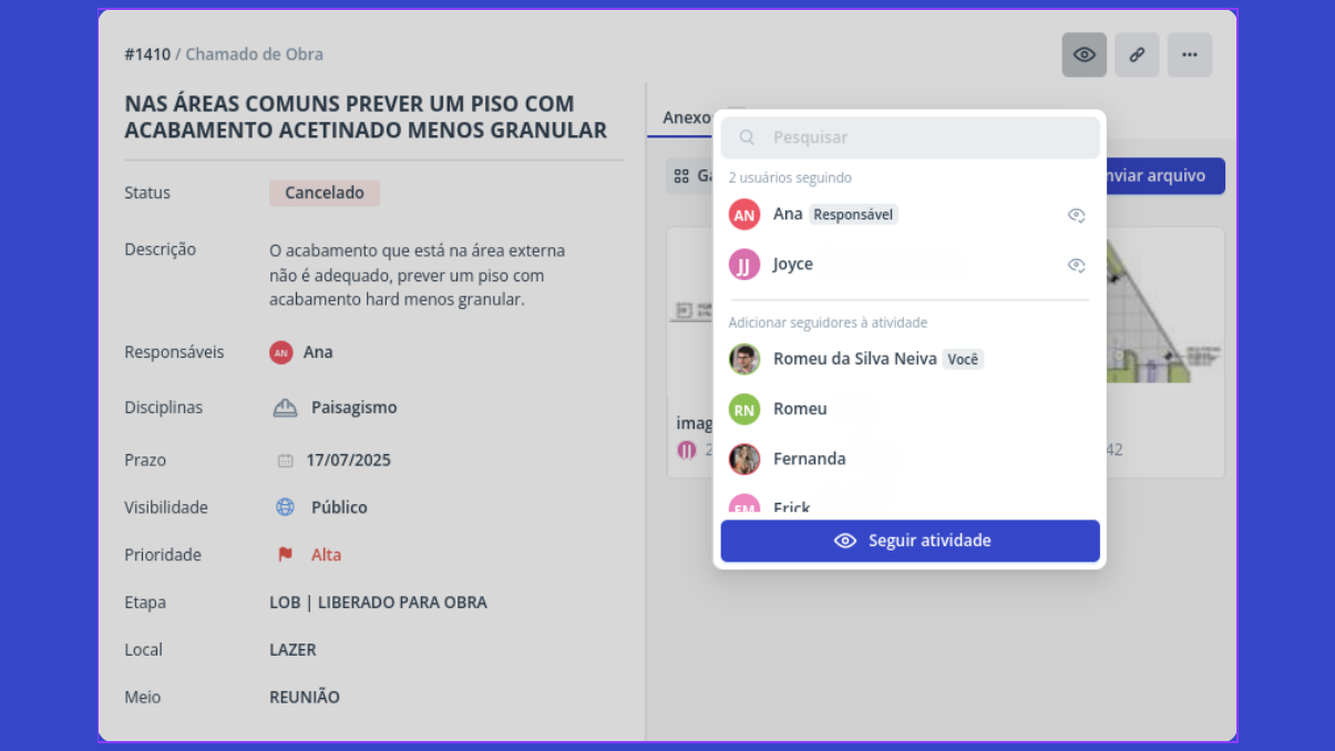 Nesse mesmo local, também é possível visualizar quem já está seguindo a atividade. A adição de novos seguidores pode ser feita por usuários com papel Administrador ou Coordenador. O usuário responsável pela atividade, passa a ser um seguidor automaticamente.